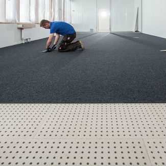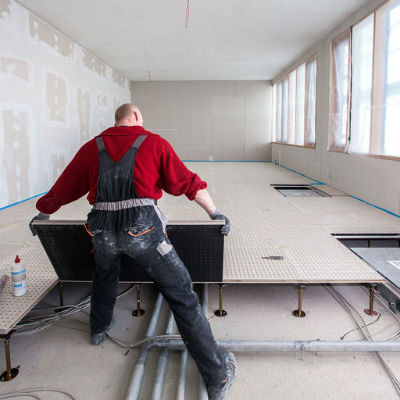 Акустична фальшива підлога Knauf GIFAfloor FHB Akustik ідеальна для офісів відкритого планування та коллцентрів : під підлогою нескладно прокласти комунікації орендарів та облаштувати люки або вежі з вмонтованими розетками . Саме таким чином без проваждення ремонту здійснювати переконфігурацію зал та перестановки меблів .