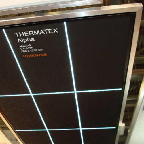 AMF Thermatex Alpha модульна акустична стеля у вигляді плит що вкладаються в підвісні каркаси 600 на 600 мм з найвищим коефіцієнтом поглинання . Пропоновано у білому , срібному та чорному кольорах . AMF Thermatex Alpha це щільна мінераловатна плита облицьована флісом . Товщина кожної плитки 19 мм , вага 3 кг на метр квадратний .