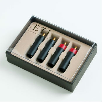 Eichmann ETI Copper Bullet Plug w/ black polymer housing небалансний конектор RCA контакти якого виготовлено мінімально необхідного розміру-маси з телуру міді та оформлено у пластиковому корпусі ( алюмінієвий , алюмінієвий золочений , воронений бронзовий корпус можливо придбати окремо ) . Конектори Bullet Plugs є унікальними через наднизьку електричну ємність та індуктивність - ноухау Eichmann : мінусовий ( земляний , екрануючий ) контакт виготовлено одним стержнем а не кільцем як у традиційного RCA конектора , плюсовий контакт виготовлено у вигляді трубки . Метал виточено роботом , ніякого лиття .