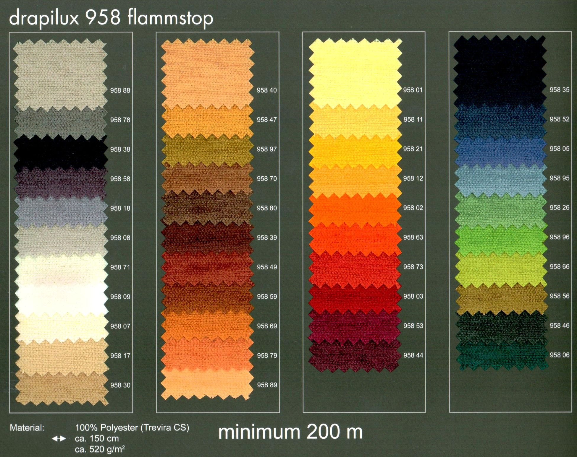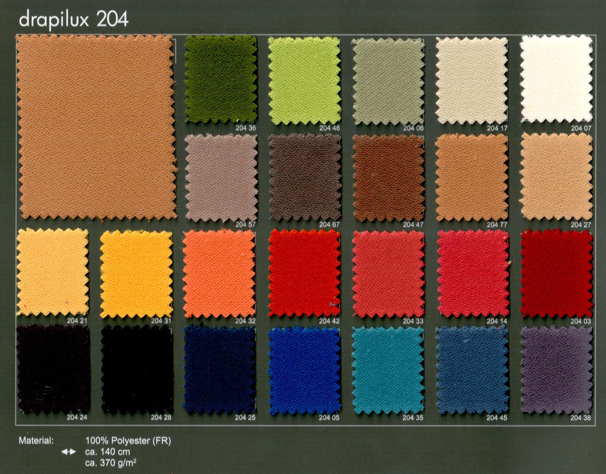 Drapilux Akustik поліестерова звукоізолююча вогнетривка тканина для виконання штор гардин з різноманітними текстурами та різними рівнями щільності від 260 до 520 грамм на метр квадратний постачається в рулонах шириною від 151-300 см та довжиною від 30 до 60 метрів . Дозволяється прати при температурі 60 градусів за Цельсієм ( може сісти на 1% ) та прасувати . Понад 50 циклів прання та сушки не ушкоджують властивостей текстилю . Доступно понад 30 різнокольорів .