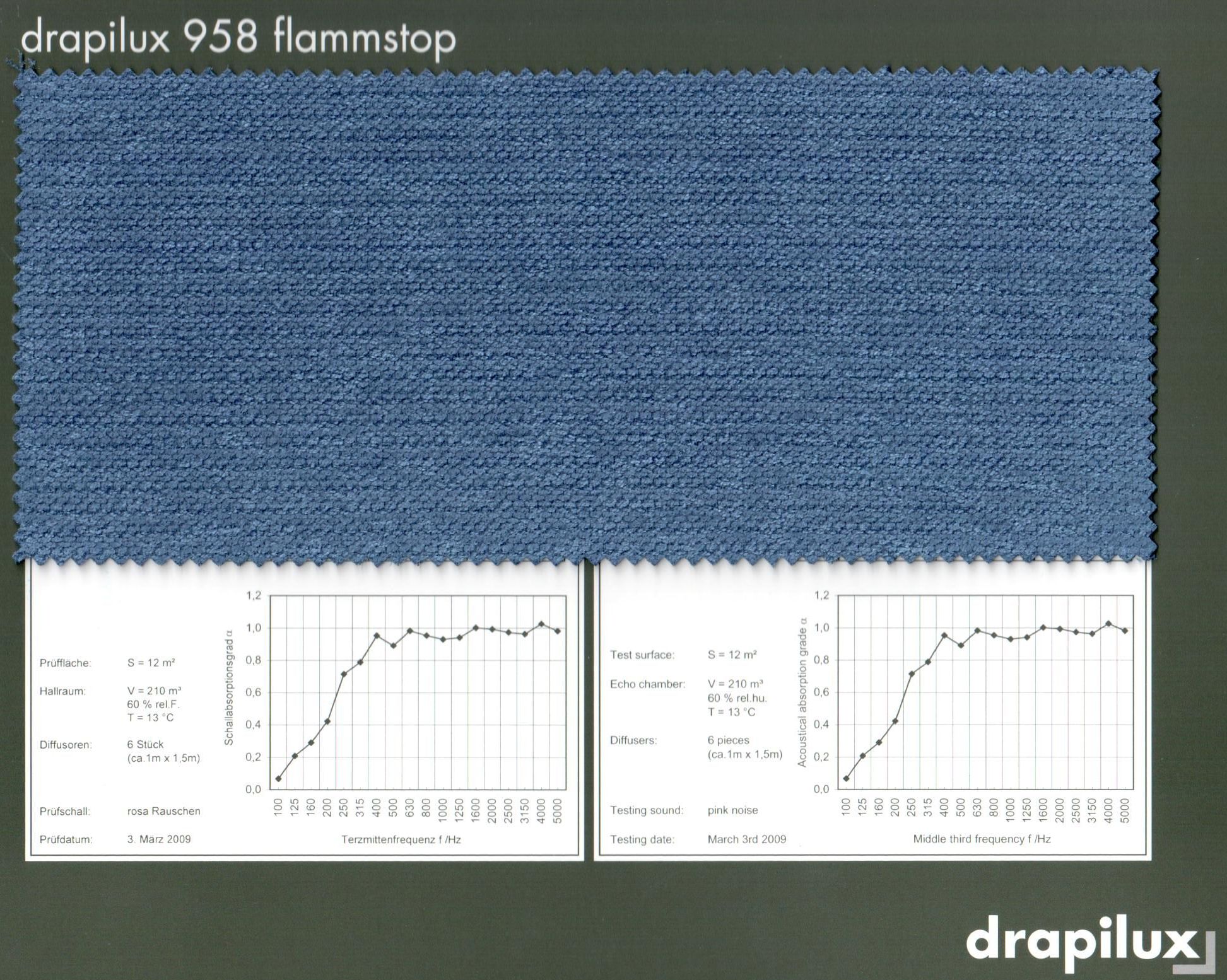 Поглинання класу D , іншими словами тканина абсорбує у себе звукові хвилі у загальній кількості від 30 до 55 % . Проте доступна важка тканина артикул 958 вагою півкілограми на метр квадратний яка забезпечує клас поглинання А при відносі від стіни мінімум 10 см .