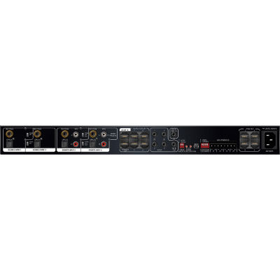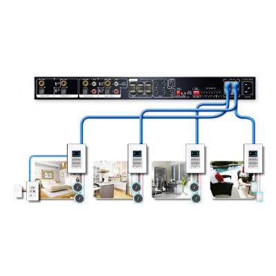 Колонки приміщень підключаються безпосередньо у ці настінні панельки - таким чином уникаєте втрат звучання та зайвих коштів через довжелезні акустичні кабелі . 4 пари колонок розміщуються по полицям кімнат , монтуються на стіни , вмонтовуються в стіни чи стелі . Якісне фонове озвучення досягається коли одна стельова колонка покриває 8 метрів площі під собою ( при висоті 3 метри від стелі до підлоги ) - наприклад на приміщення у 20 метрів квадратних достатньо двох . Якщо площа більша - використовуйте більшу кількість акустих систем - головне не порушвати вимогу виробника - кожна панелька повинна працювати з 8 омним опором на кожен канал , як це обійти - консультуйтесь у ІСС .