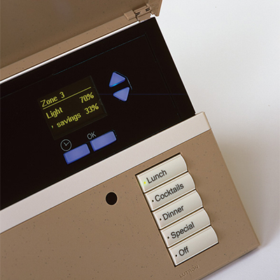 Встановлено Lutron Grafik Eye QS на стіні при вході . Якщо необхідно продублювати його 5 сценаріїв освітлення цієї кімнати то в любому потрібному місці облаштовується настінна панелька Lutron SeeTouch на ціж 5 сценаріїв ( достатньо прокласти кабель 5 катагорії ) . Доречі не обовязково облаштовувати 5 клавішну панель - можливо обрати для цього панель з 1 чи 2 чи 4 сценаріями , та чи навіть з 8 чи більше , з додатковими клавішами яскравості . Сам Grafik Eye сприймає команди з інфрачервоних пультів .